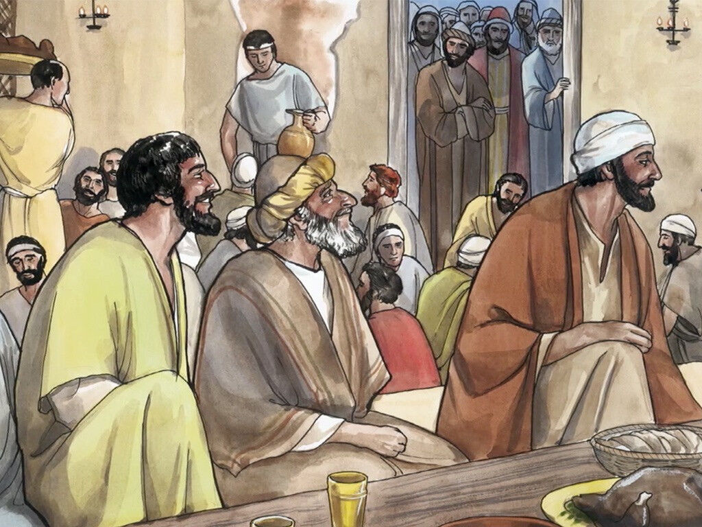 当他们看到耶稣和稅吏等罪人一同坐席,他们发出了一个带有控告意味的疑问。他们说,祂和稅吏并罪人一同吃喝吗?言外之意是,不应该这样。如果耶稣是传神国的福音,在圣洁的神的国里的人应该是像我们这种道德高尚的义人,而不应该是忘恩负义的稅吏和其他的罪人。