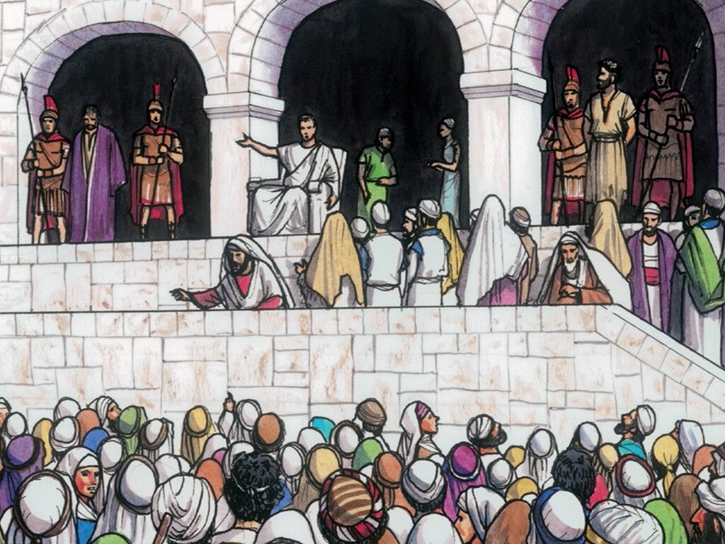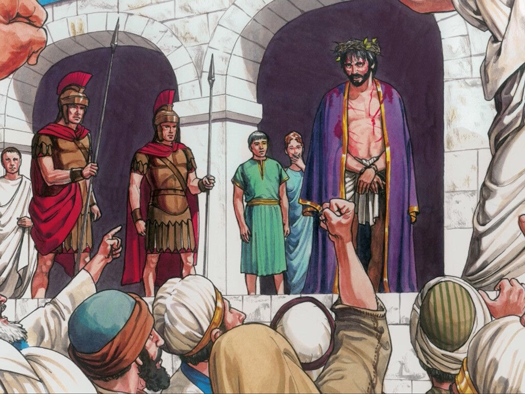 彼拉多本来以为,当犹太人看到耶稣被鞭打得遍体鳞伤、头戴荆棘冠冕的时候会有良心发现,这个无辜的人已经受到如此不公的残酷折磨,他们应当感到满意了,这样彼拉多就可以释放耶稣。但他没有想到,犹太祭司长和差役看见祂,就喊着说,“钉祂十字架!钉祂十字架!”