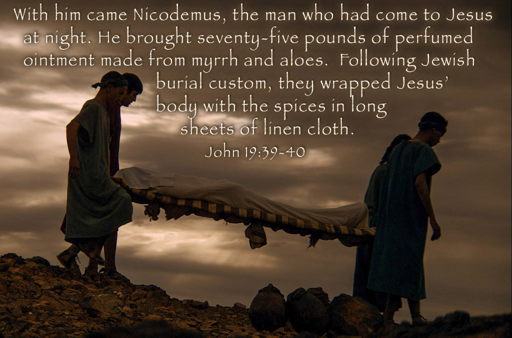 “又有尼哥底母,就是先前夜里去见耶稣的,带着没药,和沉香,约有一百斤前来。他们就照犹太人殡葬的规矩,把耶稣的身体,用细麻布加上香料裹好了。”(约19:39-40)