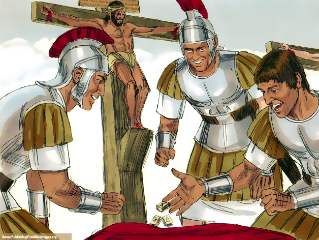 “兵丁既然将耶稣钉在十字架上,就拿祂的衣服分为四份,每兵一份。又拿祂的里衣。这件里衣,原来没有缝儿,是上下一片织成的。他们就彼此说,‘我们不要撕开,只要拈阄,看谁得着。’这要应验经上的话说,‘他们分了我的外衣,为我的里衣拈阄。’兵丁果然作了这事。”
