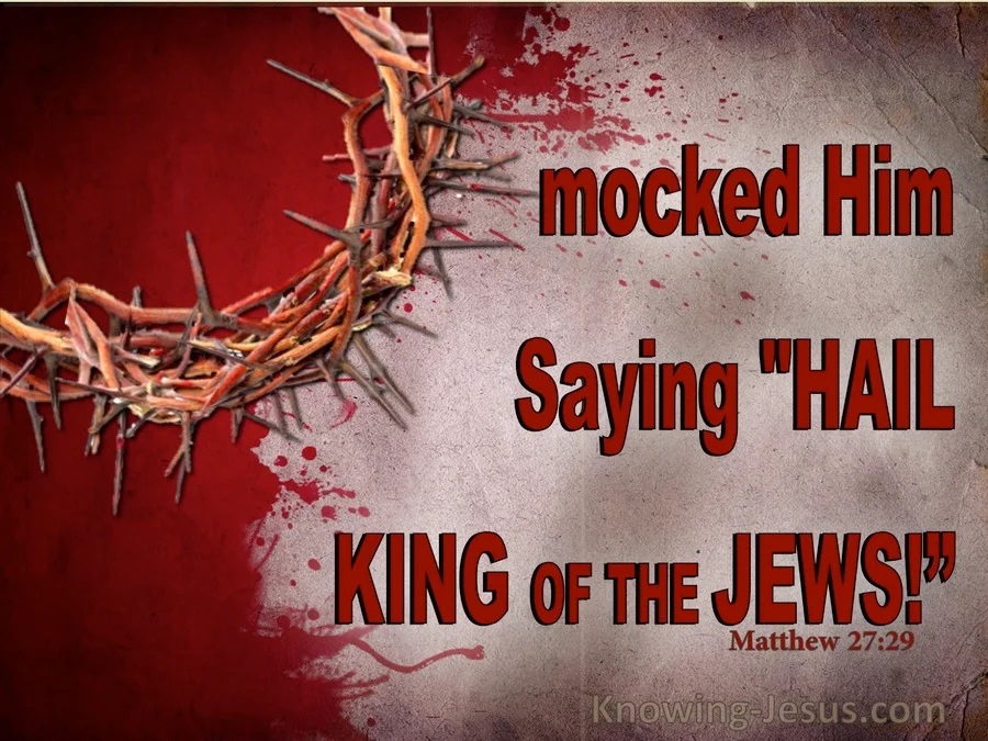 “他们给祂脱了衣服,穿上一件朱红色袍子。用荆棘编作冠冕,戴在祂头上,拿一根苇子放在祂右手里。跪在祂面前戏弄祂说,‘恭喜,犹太人的王啊。’又吐唾沫在祂脸上,拿苇子打祂的头。戏弄完了,就给祂脱了袍子,仍穿上祂自己的衣服,带祂出去,要钉十字架。”(太27:28-31)