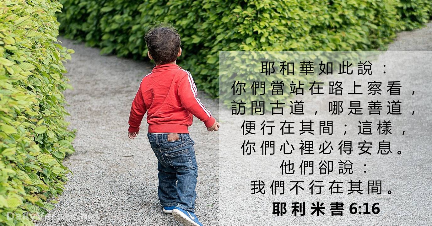 16a耶和华如此说,“你们当站在路上察看,访问古道,哪是善道……”