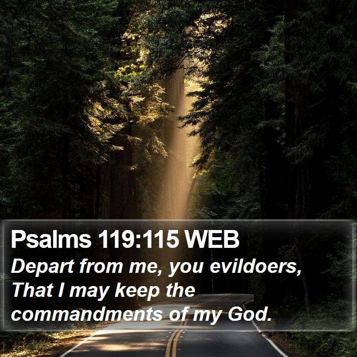 在诗篇119:63中,诗人曾说,“凡敬畏神,守神训词的人”,他“都与他作伴”。而在115节,诗人说出圣徒的另一种人生态度:让恶人远离自己,以至于他好遵守神的命令。诗人的生命表现,叫我们看到,一个与敬畏神的人为伴的人,也必定是一个让作恶的人远离自己的人。