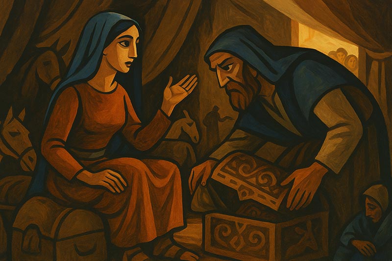 这一章提到了拉结。她灵性不太好,甚至差一点拖累了整个团队。她特别地偷了她爸爸的神像。她到底为什么偷神像?是不是她自己也迷信偶像的神力?是不是她怕对方利用偶像行法术?是不是因为这些偶像大概是金子做的?不管怎样,拉结都不应该这样做!后来她不得不把这些偶像藏在自己底下,还说自己不方便起来,才躲过去。这就让我们看见偶像的无能和无力。