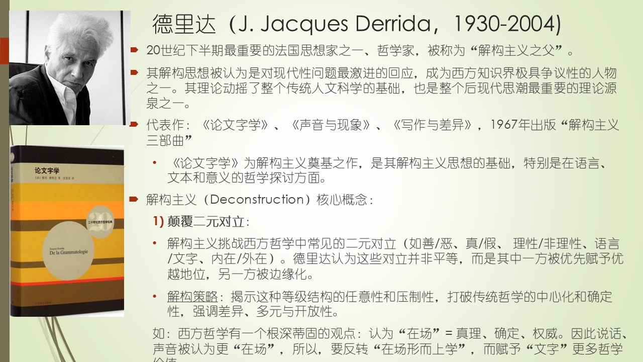 我们先看第一点:颠覆二元对立。什么是二元对立?西方哲学中常见的二元对立有:如善恶、真假、 理性非理性、语言文字、内在外在等。德里达的解构主义挑战传统的二元对立,认为这些对立并非平等,而是其中一方被赋予优越地位,另一方则被边缘化。如理性相比非理性,理性总是被赋予优越地位;语言也是比文字被赋予优越地位。德里达解构二元对立的策略是,揭示这种等级结构的任意性和压制性,打破传统哲学的中心化和确定性,如善恶这种等级结构,它有一种压制性,善用来压制恶,善处在中心位置。所以,为了打破这种中心化,解构主义就强调差异、多元与开放性,以颠覆二元对立的等级结构。