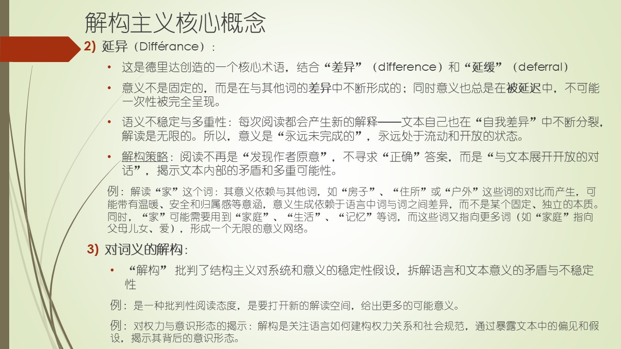 第三点,对词义的解构。解构主义是针对结构主义的,结构主义认为一切都有结构,有结构就有稳定性。解构主义将稳定性解构掉了之后,文本意义就完全不明确了,意义在流动了,会出现矛盾,解释者可以完全根据他自己的情景去理解。所以,“解构”批判了结构主义对系统和意义的稳定性假设,拆解语言和文本意义的矛盾与不稳定性。