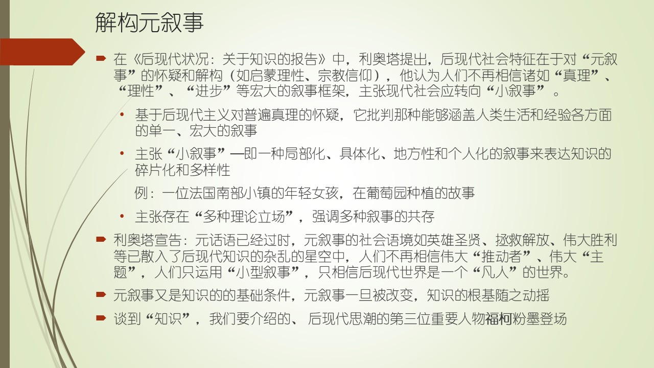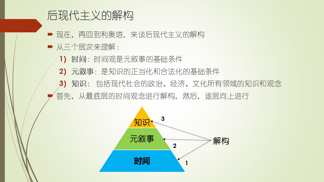 简单回顾一下,我们先从定义了后现代主义的利奥塔讲起,然后,我们了解德里达的解构主义的核心概念之后,现在,再回到利奥塔谈后现代主义的解构。可以从三个层次来理解,第一层次是时间,第二层次是元叙事,第三层次是知识。时间观是一切叙事的基础,元叙事是以时间为基础条件的宏大叙事,所以,后现代主义是从最底层的时间上去开始解构的。然后,解构建构在时间之上的元叙事,而元叙事又是知识的正当化和合法化的基础条件。前面提到,后现代主义所指的知识是包括了现代社会的政治、经济、文化等所有领域的知识和观念。所以,首先从最底层的时间观念进行解构,然后,逐层向上进行解构,最后是要解构知识。解构知识的目的是什么?我们慢慢到后面就会有答案。