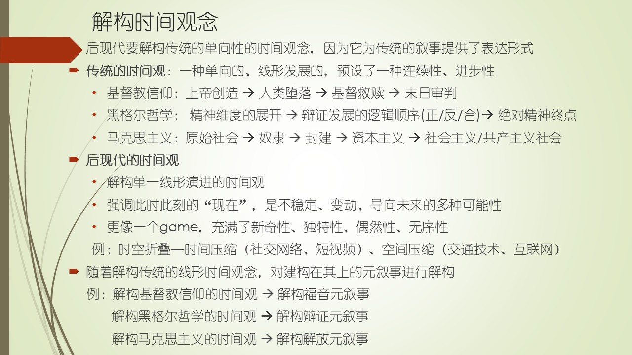 后现代主义是如何来解构时间的?时间观是整个人类文明赖以生存的最基本的观念,每一个人都有生有死,无论社会历史还是自然界的动植物都有一个开始和结束。所以,传统的时间观是一种单向的、线形发展的,它预设了一种连续性和进步性。比如说,基督教信仰的时间观是非常清晰的,根据圣经,一切始于上帝的创造,接着是人类的堕落和基督的救赎,最后末日审判和进入新天新地。比如说黑格尔的哲学,是从精神维度展开,通过辩证发展的逻辑顺序(正/反/合),最后走向绝对精神的终点。在看马克思主义的时间观,我们从小就被灌输唯物史观,人类社会的发展是从原始社会再到奴隶社会,到封建社会,到资本主义社会,再到社会主义,最后进入共产主义社会人类大同。这就也是一个线性的时间观,为其宏大叙事奠定一个基础。