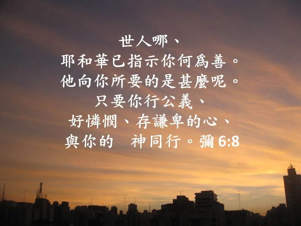 小结:神对世人,先给后要:先将“何为善”和祂的“善”给了我们。并且要我们有个人的回应:行公义。不在个人生活中行公义的人,会用自己的标准和暴力的方式,评判、攻击别人。即使靠自己行了公义,进入群体生活时,也缺乏怜悯软弱者的心。按照神所指示的善活出公义的行为,就会继续在怜悯心上成长,并且存谦卑的心与神同行。因为我们靠着恩典蒙恩;靠着恩典成圣。