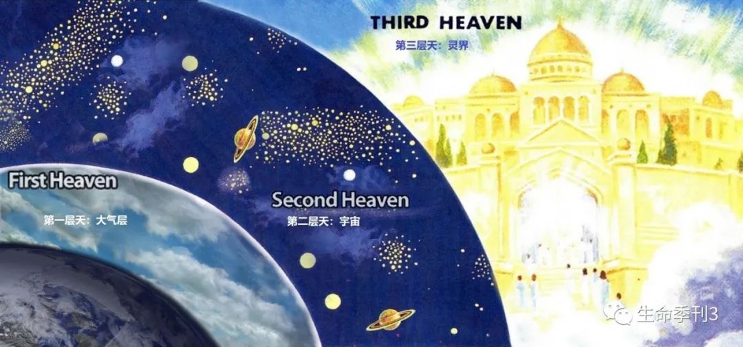 从下面的图画我们可以知道按照当时犹太人的理解,地球以外有三层天:第一层天是大气层,也就是我们肉眼可以看到的天空;第二层天是宇宙,无数星宿银河所在之处,人类目前只能够探索一点点而已;第三层天是灵界,也就是乐园,神所在之处。
