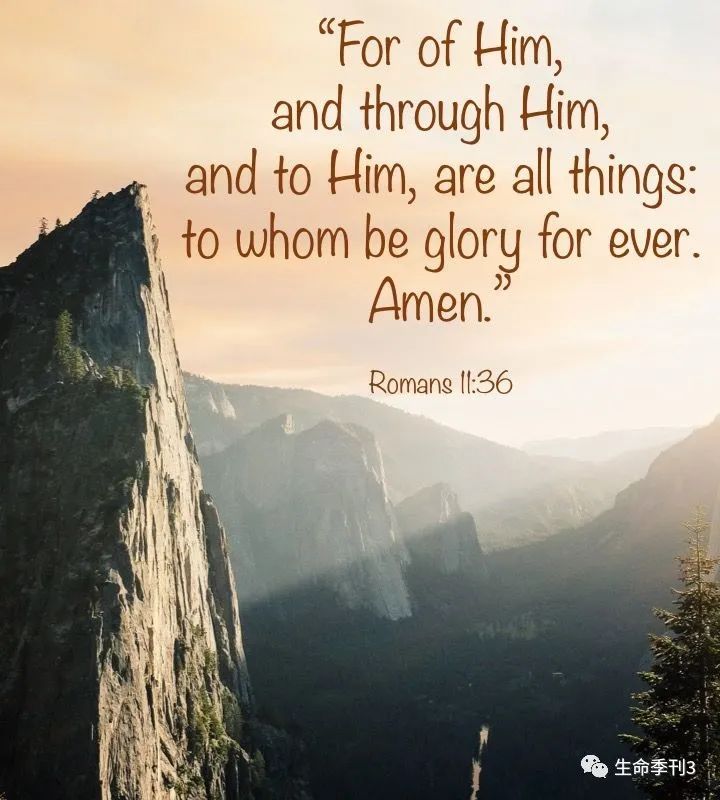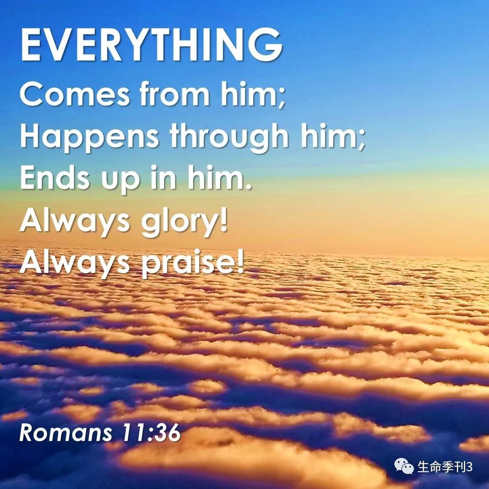 可见所有的事,万有,都是本于祂,倚靠祂,也是归于祂。都是为着祂的目的预旨。祂的旨意会引导着所有的事物都必按照祂所定规的时间和地点来发生。这样是为了什么呢?这都是为了祂的荣耀。