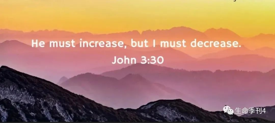 “约翰说,‘若不是从天上赐的,人就不能得什么。我曾说,我不是基督,是奉差遣在祂前面的,你们自己可以给我作见证。娶新妇的,就是新郎。新郎的朋友站着听见新郎的声音就甚喜乐。故此我这喜乐满足了。祂必兴旺,我必衰微。’”(约3:27-30)